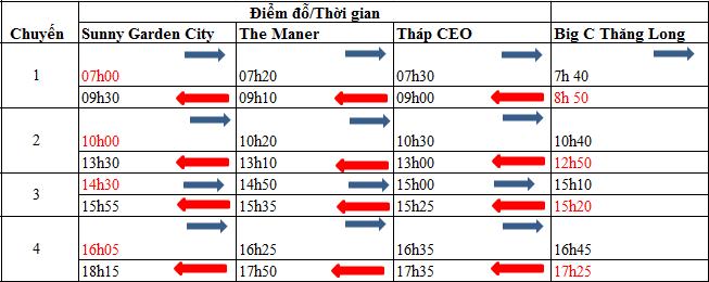 Lịch trình cụ thể: KĐT Sunny Garden City – The Manor Mỹ Đình – tháp CEO Phạm Hùng – BigC Thăng Long. Xe bus hoạt động 24/7, một ngày chạy 4 chuyến theo đúng lịch trình.