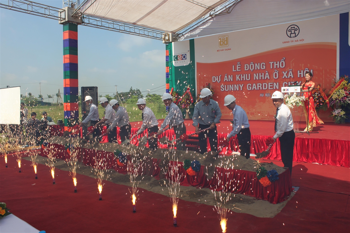 Các đại biểu thực hiện nghi thức động thổ dự án Khu nhà ở xã hội Bamboo Garden tại KĐT Sunny Garden City.