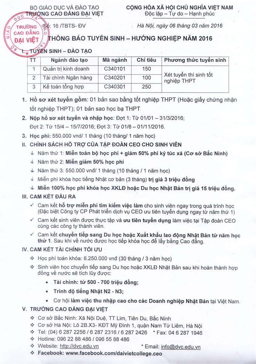 Trường Cao đẳng Đại Việt tổ chức tuyển sinh – đào tạo chuyên ngành: Quản trị kinh doanh, Tài chính Ngân hàng và Kế toán tổng hợp. Thời gian nộp hồ sơ xét tuyển và nhập học: Đợt 1: từ 01/01 – 31/3/2016, Đợt 2: từ 15/4 – 15/7/2016; Đợt 3: từ 01/8 – 01/11/2016